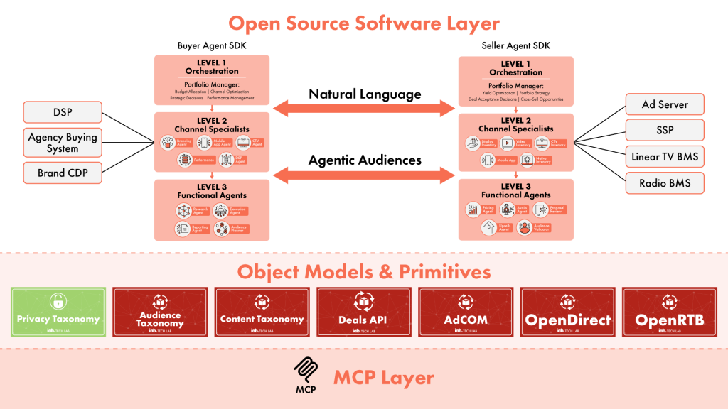 The second layer is the collection of Object Models and Primitives which ensure the Agents stay on track. These are based on existing Taxonomies. including the Privacy Taxonomy, and Tech Lab Standards such as the Deals API and AdCOM.